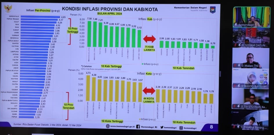 Dalam pembahasan Rakor inflasi dengan Mendagri, disampaikan, inflasi Sulbar pada April 2024 mengalami penurunan menjadi 2,02 persen, kondisi inflasi tersebut menempatkan Sulbar diperingkat ketiga secara Nasional.