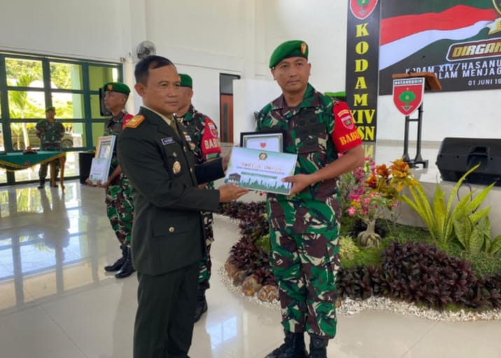 Seorang prajurit yang dinilai memberikan kontribusi besar bagi wilayah kerjanya. Tak lain, Ahmad Suharnowo atau biasa disapa Ahmad, dia kaget dan gembira saat disebut namanya untuk menerima hadiah dari Pangdam XIV Hasanuddin.