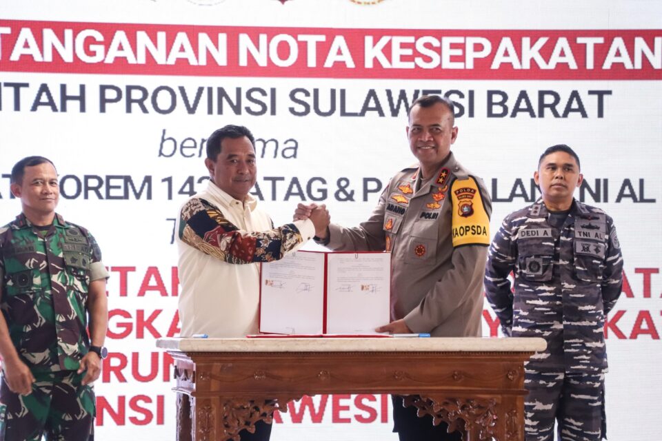 Pj. Gubernur Sulbar, Bahtiar Baharuddin saat melakukan penandatanganan kerja sama dengan Kapolda, Danlanal, juga Danrem. (Dok. Humas Pemprov Sulbar).