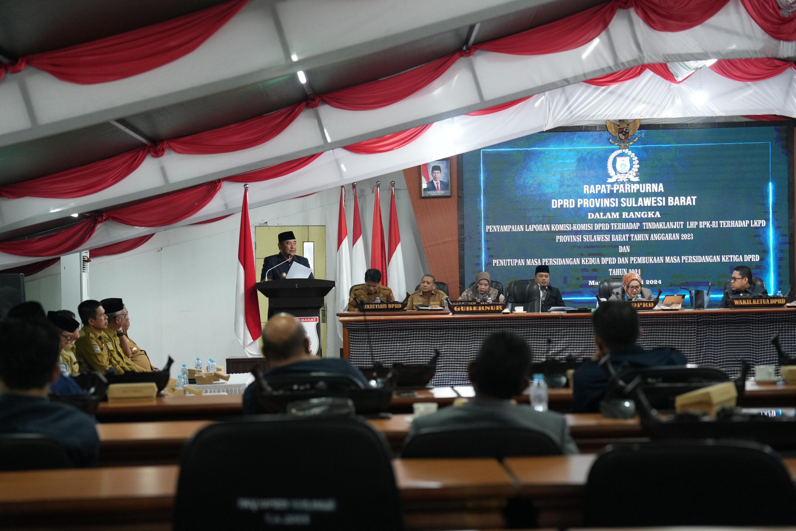 Pj.Gubernur Sulbar, Bahtiar Baharuddin saat sambutan dalam kegiatan Penyampaian Laporan Komisi-Komisi DPRD Terhadap Tindak lanjut LHP BPK-RI Terhadap LKPD Sulbar T.A 2023. (Dok. Humas Pemprov Sulbar).