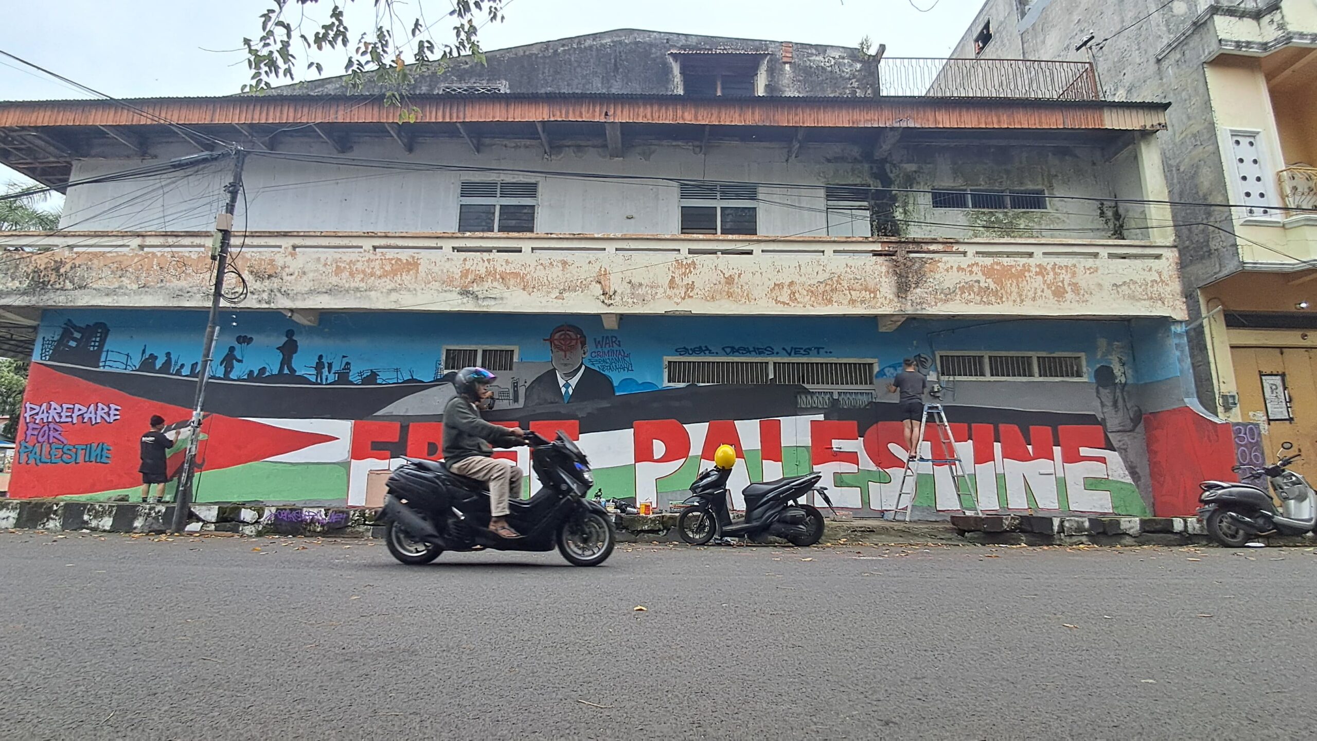 Lukisan mural yang dituliskan para seniman ini, “Free Palestine” dan “All Eyes On Rafah”.