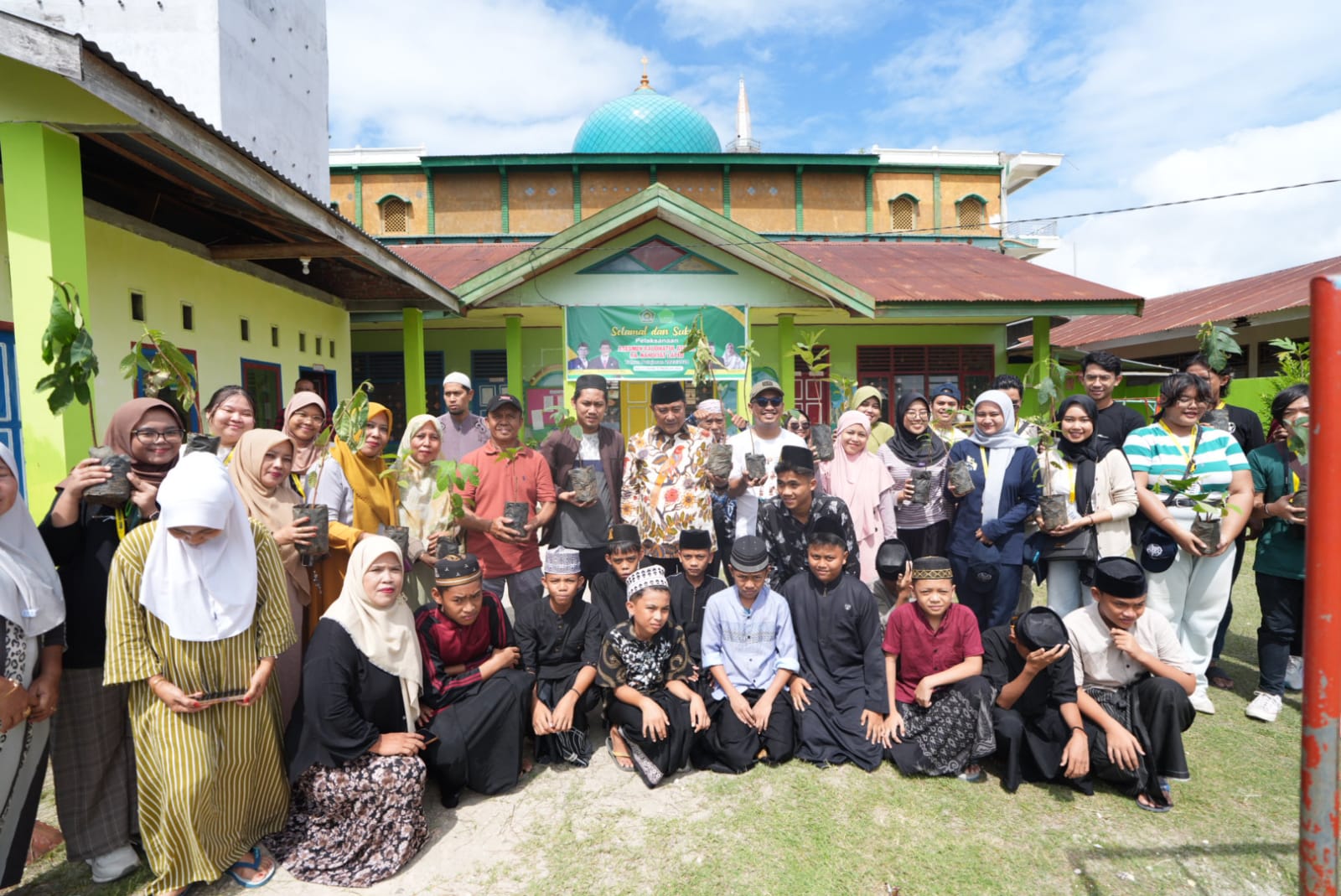 Alsa bersama rekan rekannya menanam pohon sukun yang disiapkan oleh Pj Bahtiar. Setidaknya satu mahasiswa menanam dua pohon sukun secara simbolik.