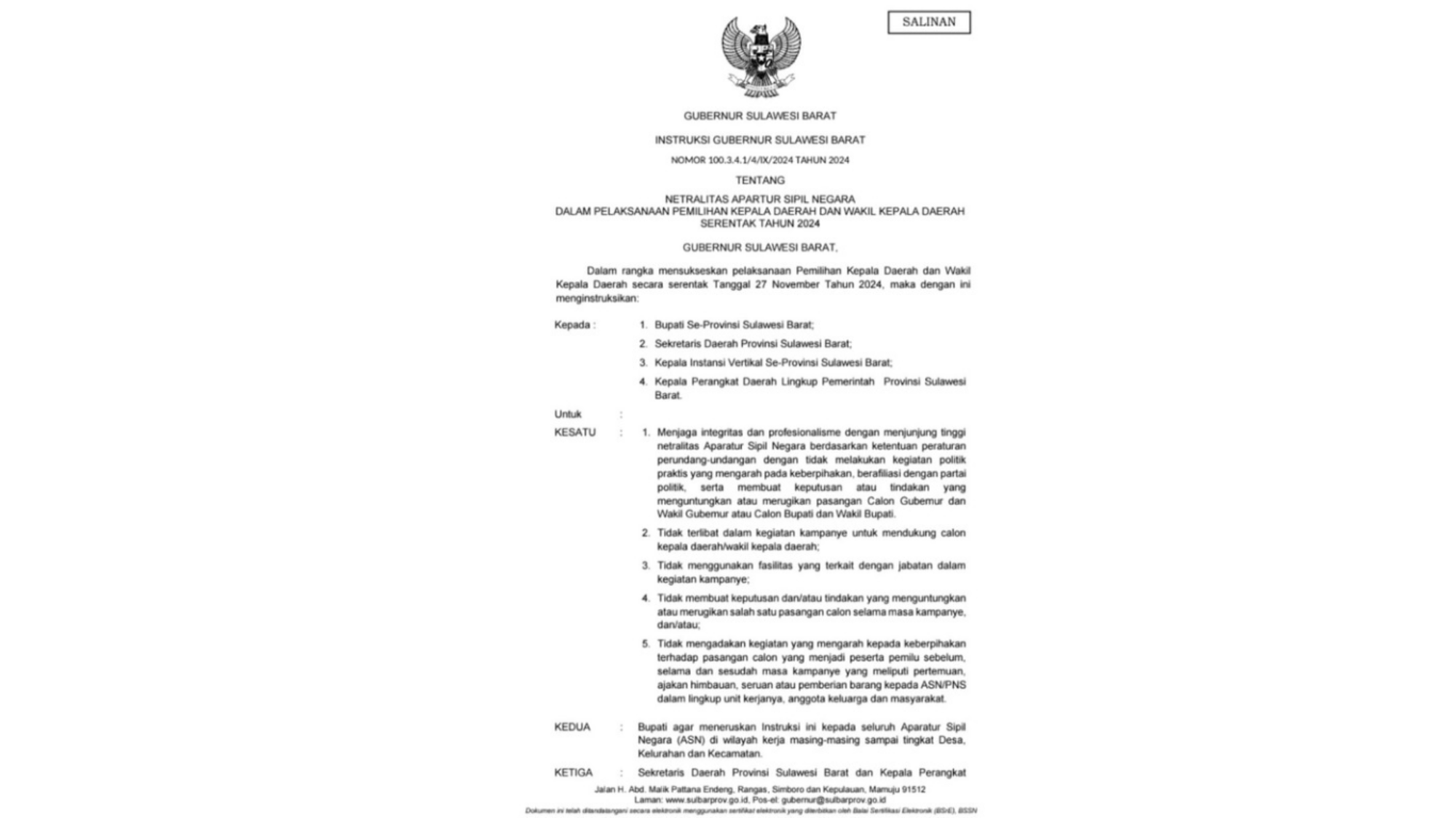 Hal ini ditegaskan melalui Surat Instruksi Gubernur Sulawesi Barat Nomor 100.3.4.1/4/IX/2024 Tahun 2024 tentang Netralitas Aparatur Sipil Negara dalam pelaksanaan Pilkada Serentak 2024 mulai berlaku per tanggal 25 September 2024.