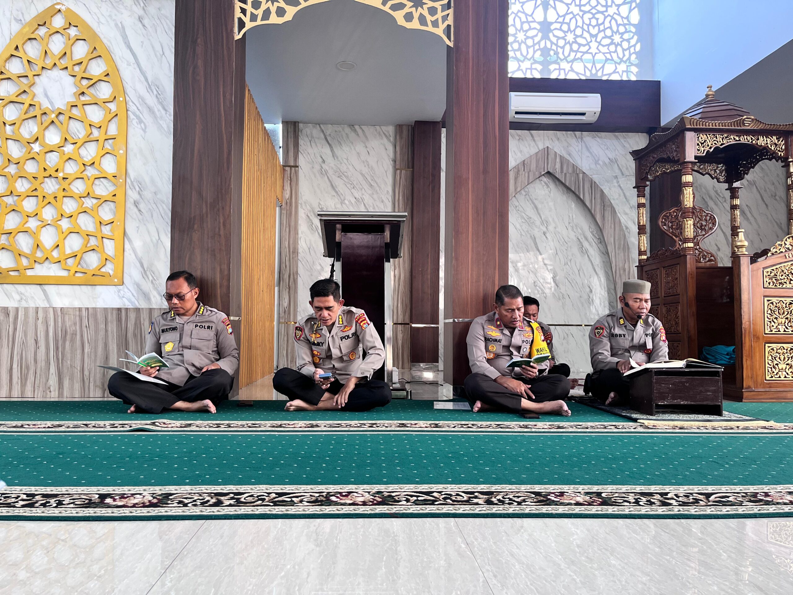 Suasana khidmat menyelimuti masjid Jabal Rahmah Mapolda saat seluruh personel yang muslim berkumpul mengikuti kegiatan Binrohtal yang diisi dengan yasinan, lantunan Asmaul husnah, nasehat agama dan ditutup dengan doa, Kamis (3/10/2024).