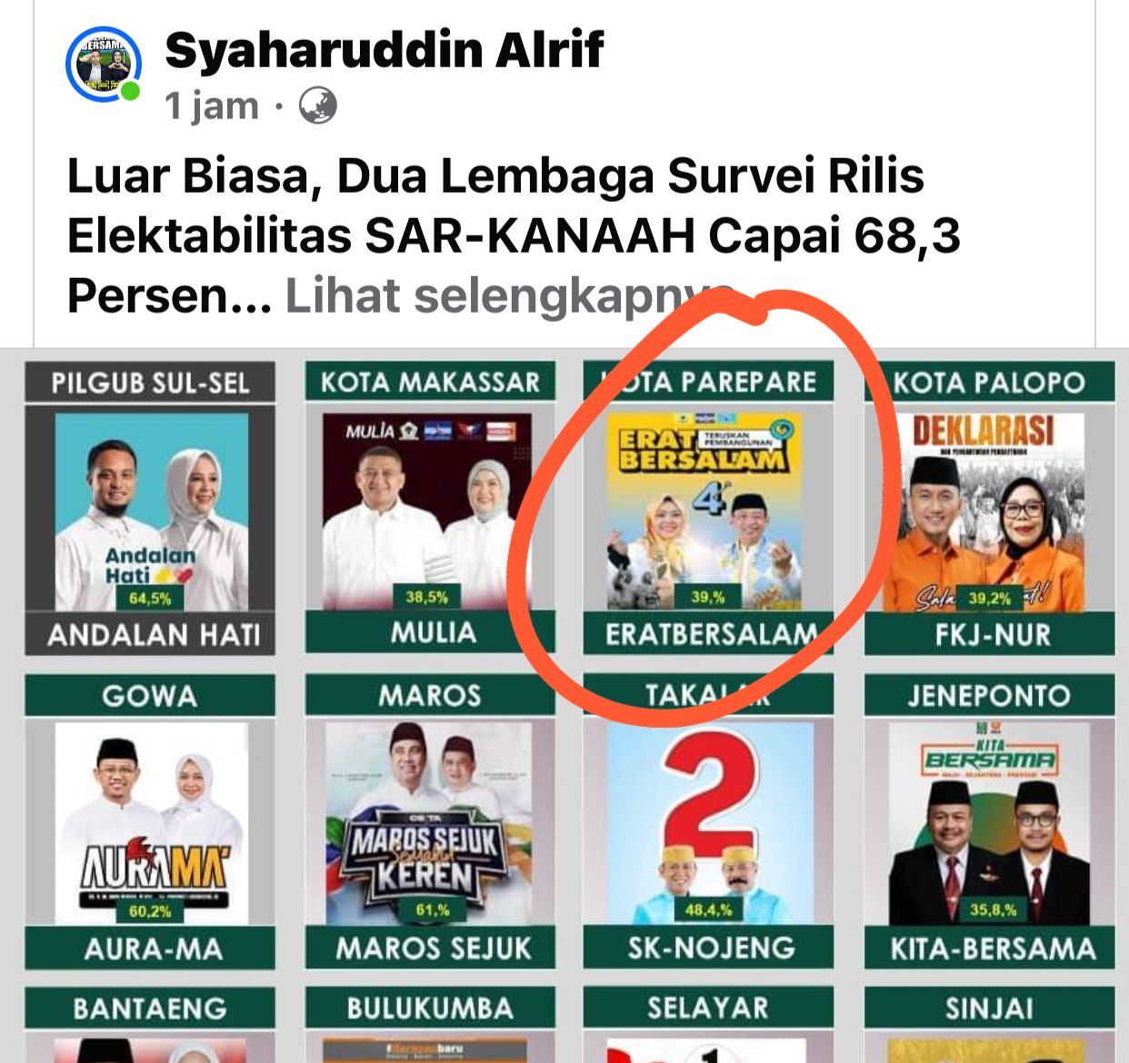 ANALYSIS.CO.ID, Parepare – Sekretaris DPW Nasdem Sulsel Syaharuddin Alrif mengunggah hasil survei Pilkada Serentak 2024, di akun media sosialnya.