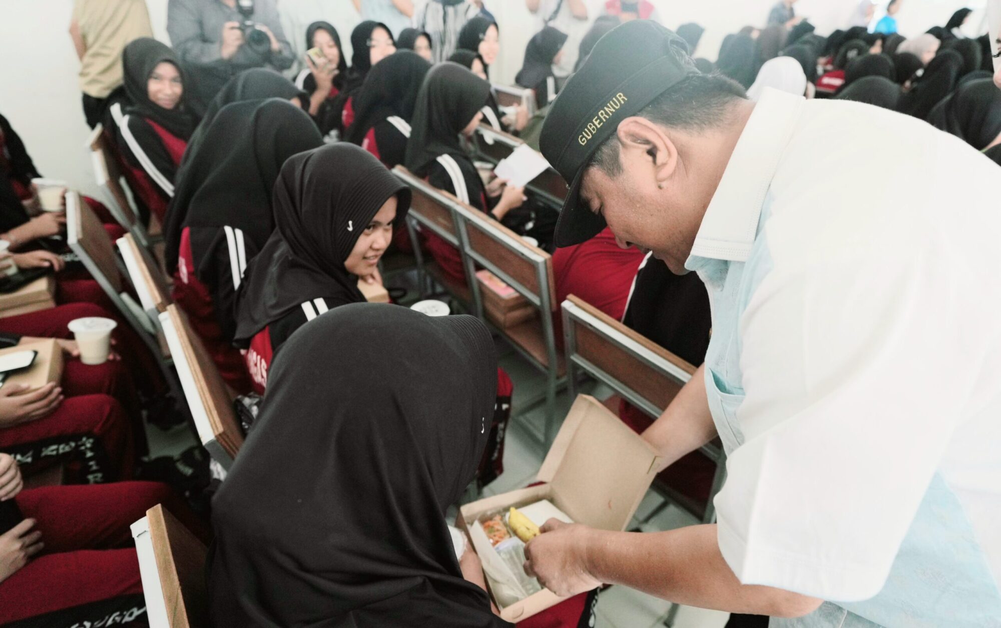 Bahtiar Baharuddin menjau uji coba program pemberian makanan bergizi seimbang gratis di SMKN 1 Rangas Mamuju.