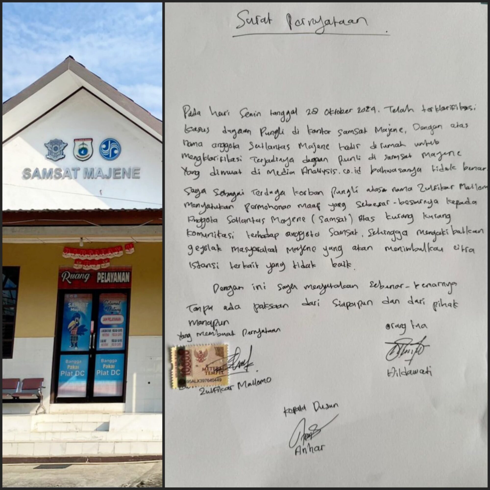 Dalam klarifikasinya, ZR menyatakan bahwa informasi yang tersebar tidak benar dan meminta maaf kepada pihak Satuan Lalu Lintas (Satlantas) Majene yang bertanggung jawab atas pelayanan di Samsat.