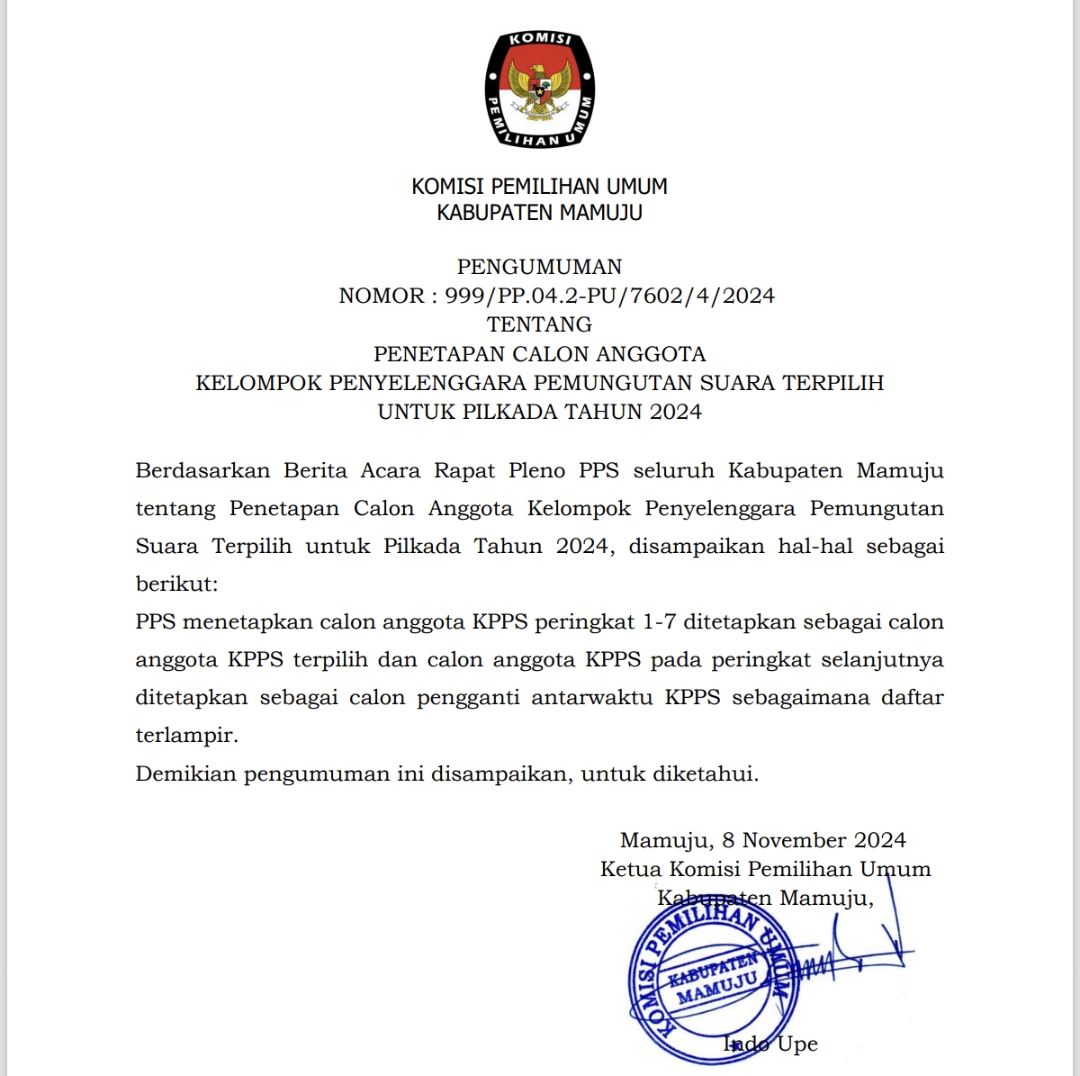 Surat pengumuman penetapan calon anggota KPPS se-Kabupaten Mamuju.