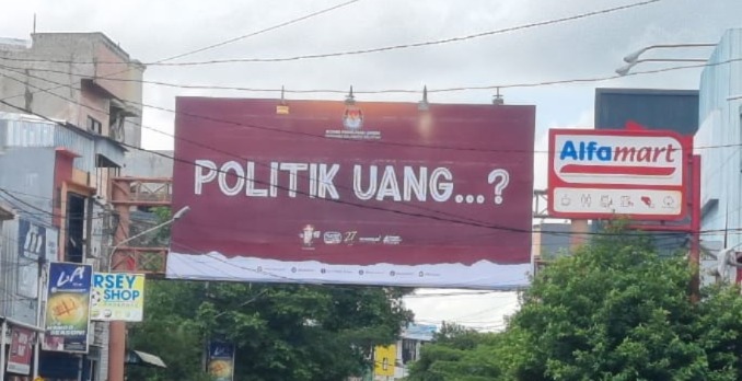 Baliho besar itu bertuliskan dua kata, “Politik Uang…?”, yang terpasang di Jalan Bau Massepe, Kecamatan Ujung, Kota Parepare.