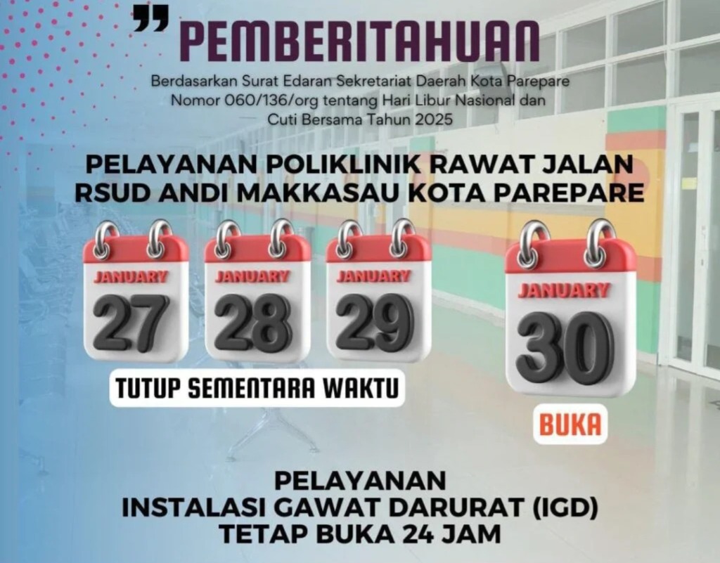 Berdasarkan Surat Edaran Pemerintah Kota Parepare Nomor 060/136/Org tentang Hari Libur Nasional dan Cuti Bersama Tahun 2025, pelayanan poliklinik rawat jalan di RSUD Andi Makkasau tutup sementara pada 27, 28, 29 Januari 2025. Dan kembali buka normal seperti biasa pada 30 Januari 2025.