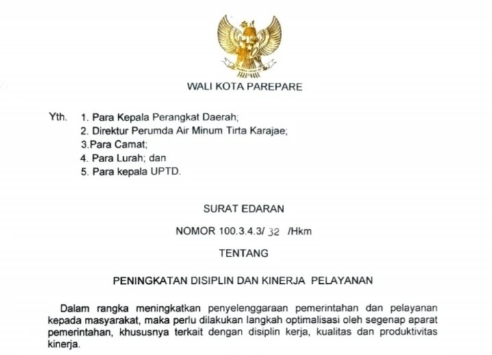 Surat edaran ini diharapkan mampu menciptakan lingkungan kerja yang lebih disiplin dan produktif, serta meningkatkan kualitas pelayanan kepada masyarakat di Kota Parepare. (*)