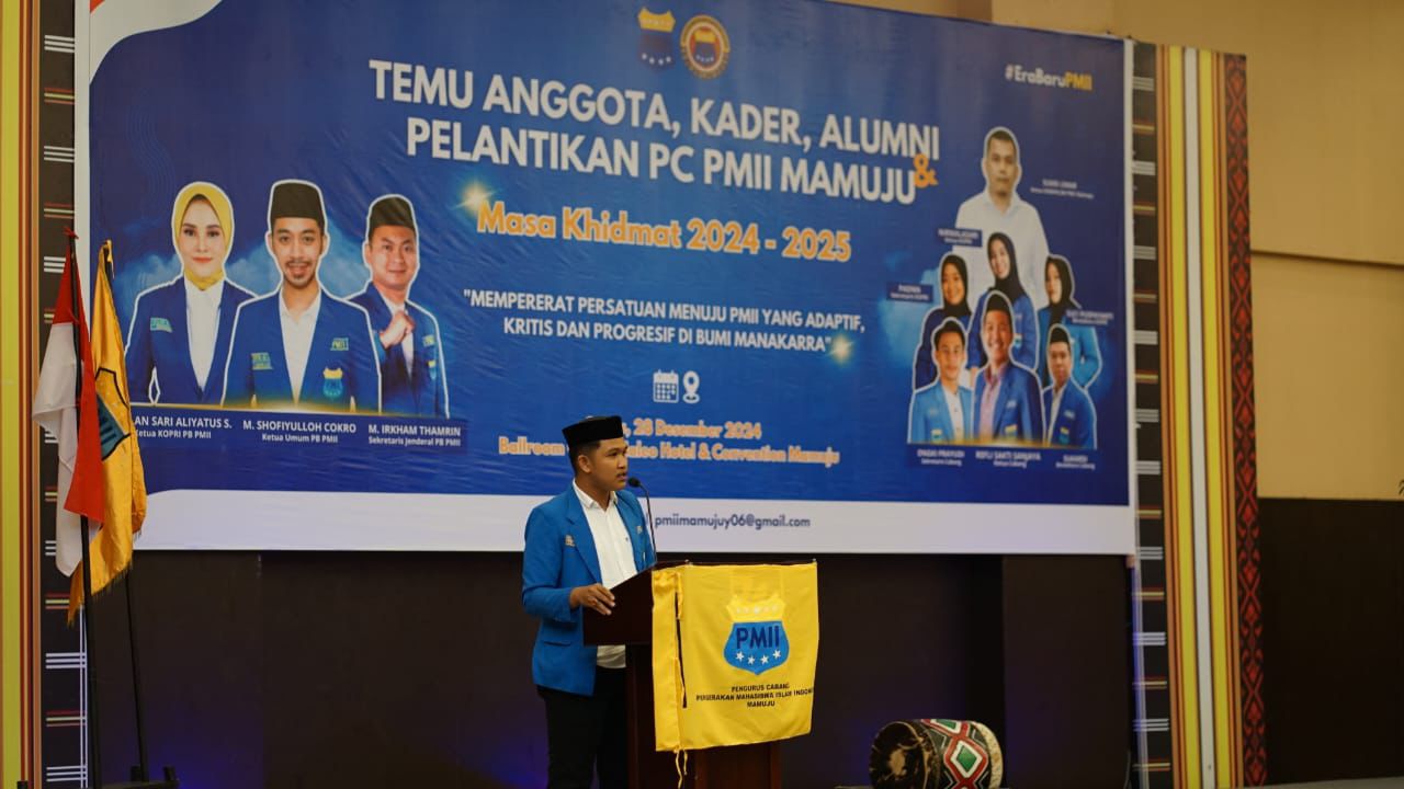Ketua PMII Cabang Mamuju, Refly Sakti Sanjaya saat melakukan sambutan di acara silaturahmi kader dan alumni PMII.