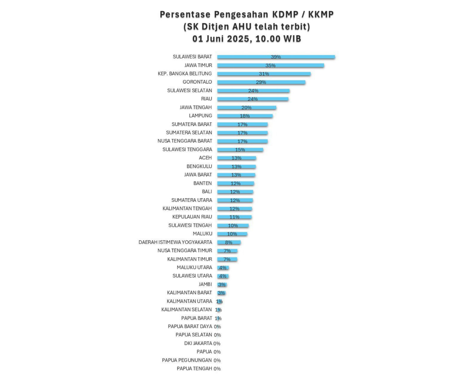 ANALYSIS.CO.ID, Mamuju – Direktorat Jenderal Administrasi Hukum umum (Ditjen AHU) Merilis data terkini sekira pukul 10.00 WIB, Minggu, 1 Juni 2025. Persentase pengesahan Koperasi Desa Kelurahan Merah Putih (KDMP) dan Koperasi Kelurahan Merah Putih (KKMP) menempatkan Provinsi Sulawesi Barat di peringkat pertama capaian pembentukan dan pengesahan Koperasi Desa Kelurahan Merah Putih.