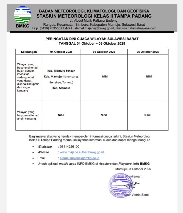 ANALYSIS.ID, Mamuju – Badan Penanggulangan Bencana Daerah (BPBD) Provinsi Sulawesi Barat (Sulbar) menyampaikan informasi resmi dari BMKG Stasiun Meteorologi Kelas II Tampa Padang Mamuju terkait peringatan dini cuaca untuk periode 04-06 Oktober 2025.