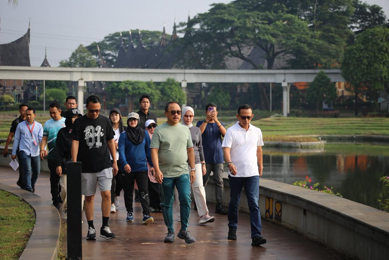 Kegiatan diawali dengan sesi joging santai di area TMII sebagai upaya menjaga kebugaran dan memperkuat kekompakan jajaran pemerintahan. Setelah itu, rombongan melanjutkan agenda peninjauan Ajungan Sulawesi Barat untuk memastikan kesiapan fasilitas, kualitas tampilan budaya, serta penguatan promosi daerah di kawasan ikon wisata nasional tersebut.