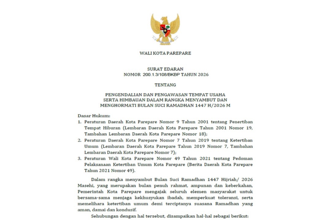 Analysis.id, Parepare – Wali Kota Parepare Tasming Hamid resmi mengeluarkan surat edaran terkait operasional tempat usaha hiburan selama bulan suci Ramadan 1447 H/2026 M. Dalam aturan tersebut, seluruh Tempat Hiburan Malam (THM) di Kota Parepare wajib tutup total.
